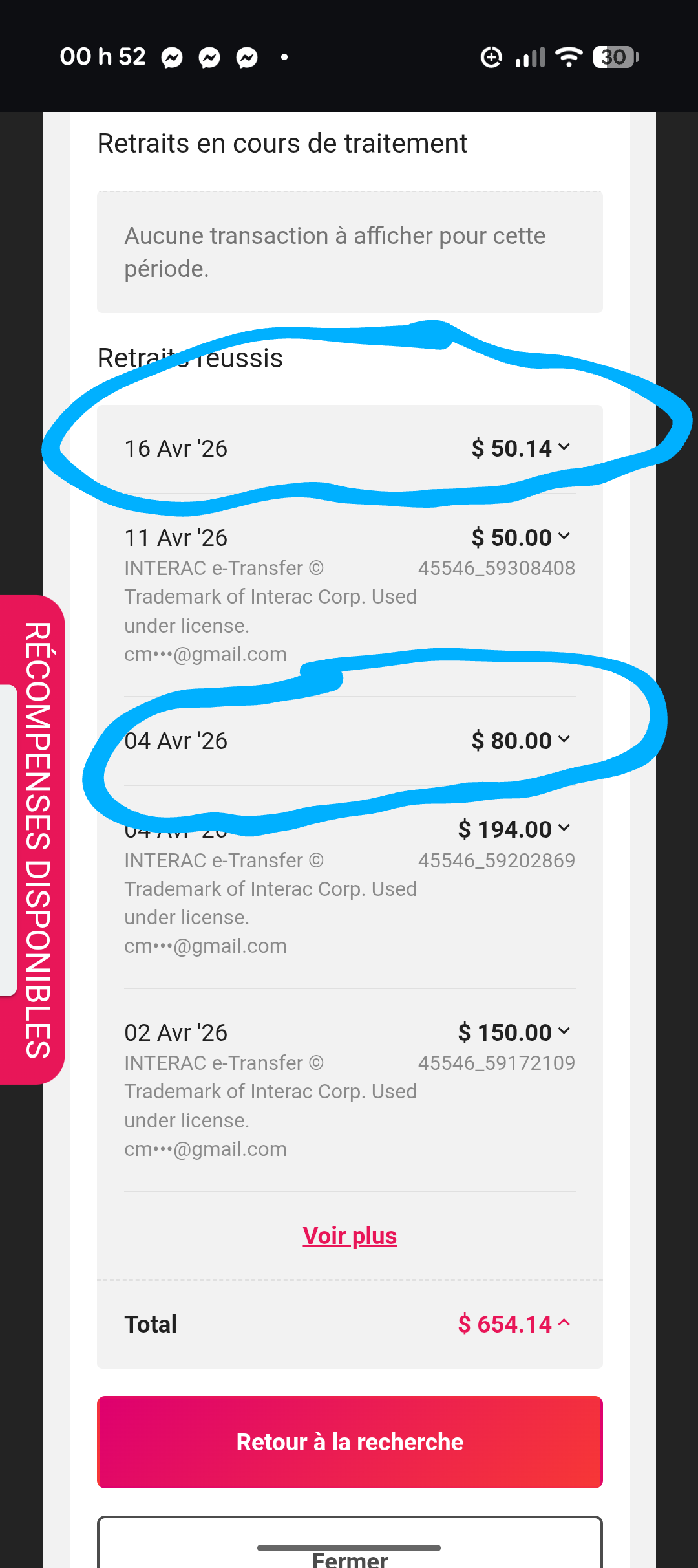 Voici l'historique de mes retrait effectué. Les deux qui sont encerclé, n'ont jamais été déposer a mon compte par virement pourtant ils affiché comme étant retiré avec succès. Ça fait donc au total 130,00 qu'il “perdent” entre deux réseaux internet.