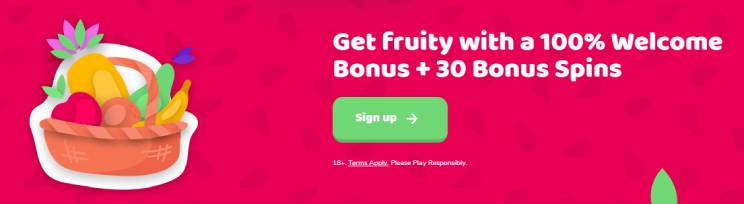 Fruity Casa casino offers a welcome package that consists of a 100% matched bonus up to C$100 along with 20 bonus spins, and players will get 10 bonus spins just for registering (they can be used on NetEnt’s Berry Burst slot game). If you make a deposit of C$100, the operator will match your sum 100% and award you with C$200 (and 20 free spins). Here are the bonus terms and conditions: